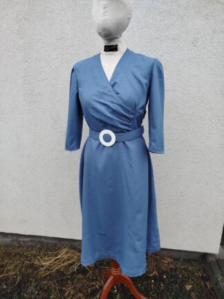 Beautiful 1940s-inspired dress in a muted blue shade, carefully handmade using an original late-1940s pattern. A timeless, elegant silhouette that highlights the waist and flatters the bust thanks to the wrap-style bodice and gentle gathering.